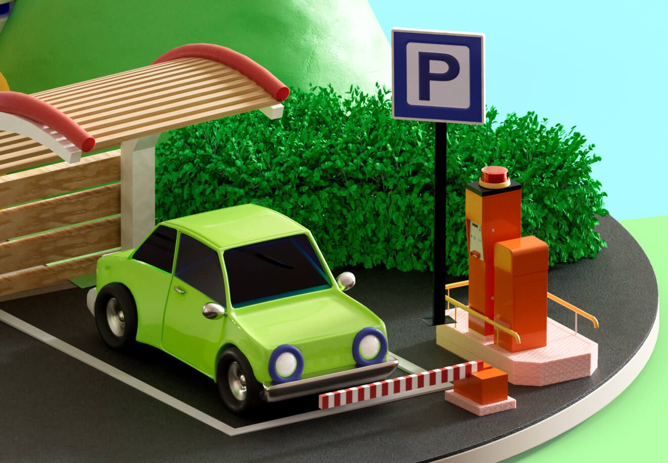 Comunicar la cercanía del aeropuerto al aparcamiento en una sola escena con una animación sencilla pero impactante. Para lograrlo, utilizamos vistas isométricas, colores vibrantes y texturas tipo plastilina. Tuvimos que guiar la mirada del espectador de un lugar a otro sin mover la cámara. ¿Cómo lo hicimos? Decidimos rotar la escena mientras nuestro amigo Mike cruzaba de un sitio a otro.